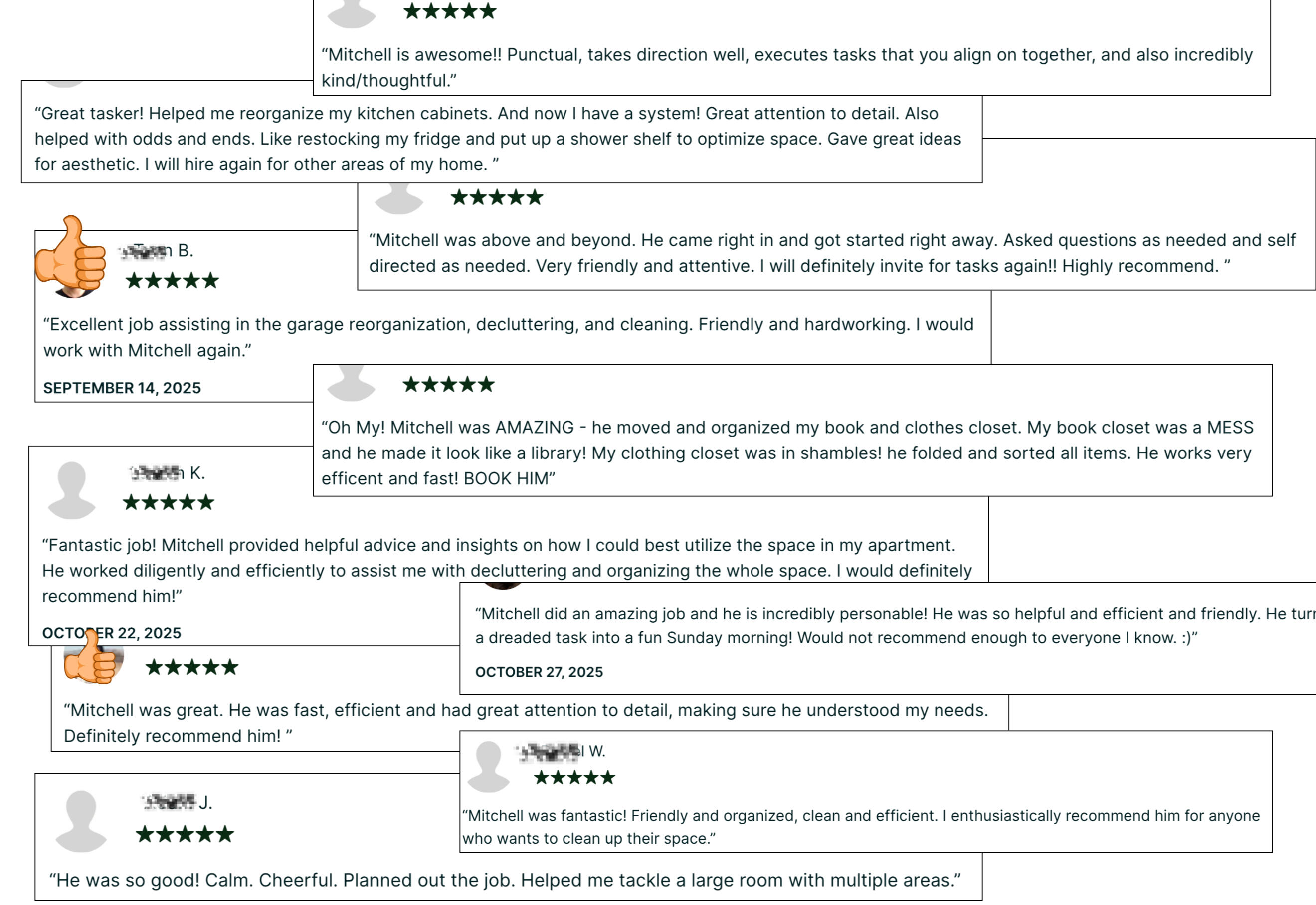 Hi, I’m Mitchell, a professional organizer serving busy professionals and families across NYC.If you're feeling overwhelmed by clutter and need a space that finally works, I'm here to make that happen for you. I create practical, sustainable systems so your home feels calm, functional, and easy to maintain.My clients consistently rate me 5 stars. I understand that inviting someone to organize your home is personal, and I take that trust seriously. No judgment. Just results.See what they say below.